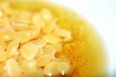 Für mein Sehnenwachs verwende ich Bienenwachs und etwas Kolophonium[1]. Kolophonium, das auch für die Bögen verschiedener Streichinstrumente verwendet wird, macht das Wachs formbarer (weniger bröckelig) und etwas zäher. Es kann auch ganz weggelassen werden, etwa falls eine Kontaktallergie besteht. Allerdings verliert das Wachs dann seine formbare, leicht an Carambar erinnernde Konsistenz.