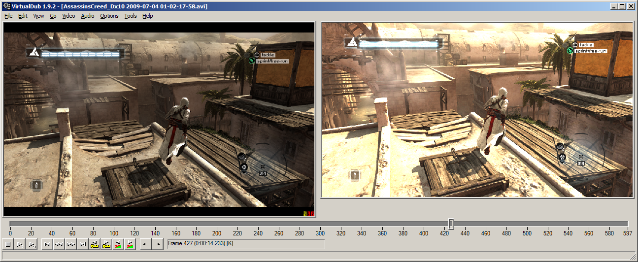 The two video frames in VirtualDub show your input video on the left and the output video (with applied filters) on the right. The slider below allows you to navigate in your video; if it is too sensitive, resize your window to increase the length of the slider. Below the current position is shown: The frame number (starts with 0) followed by the time.
